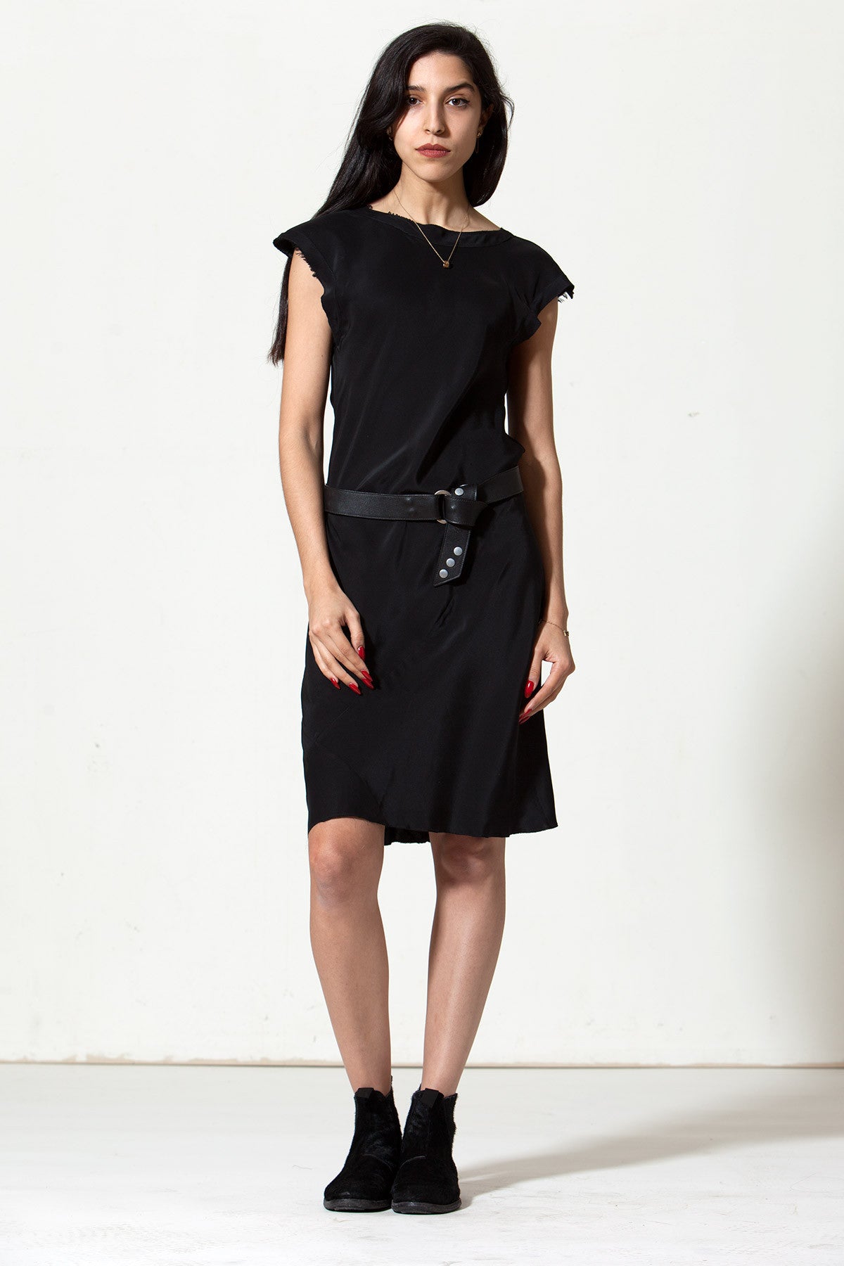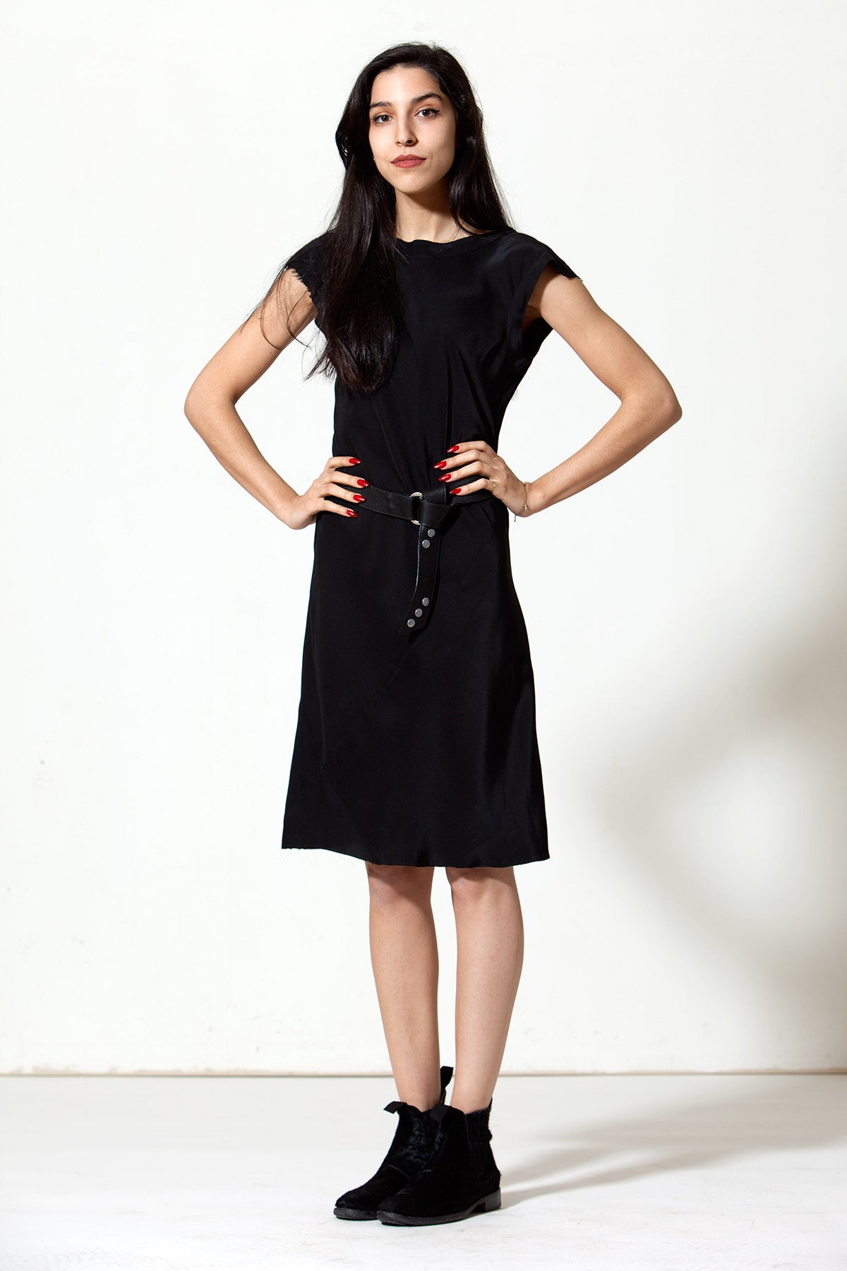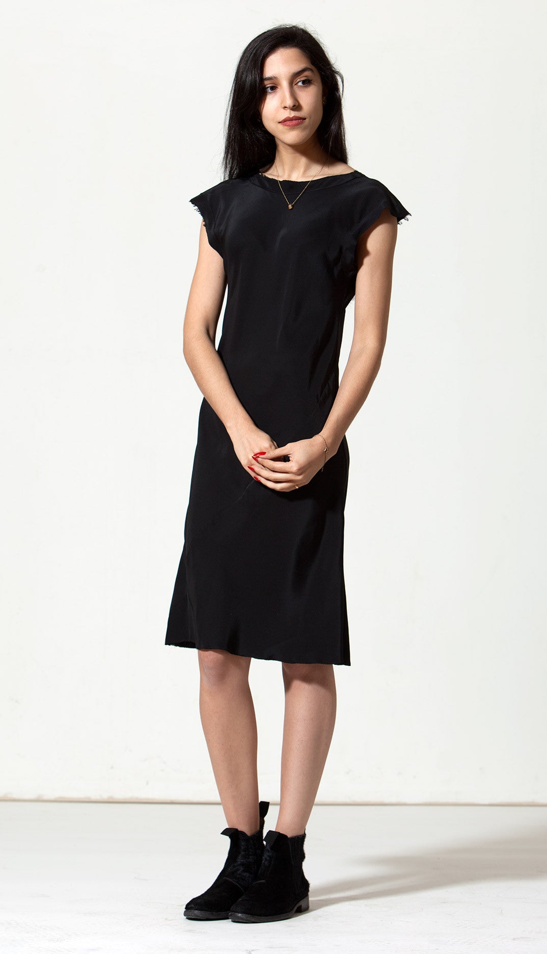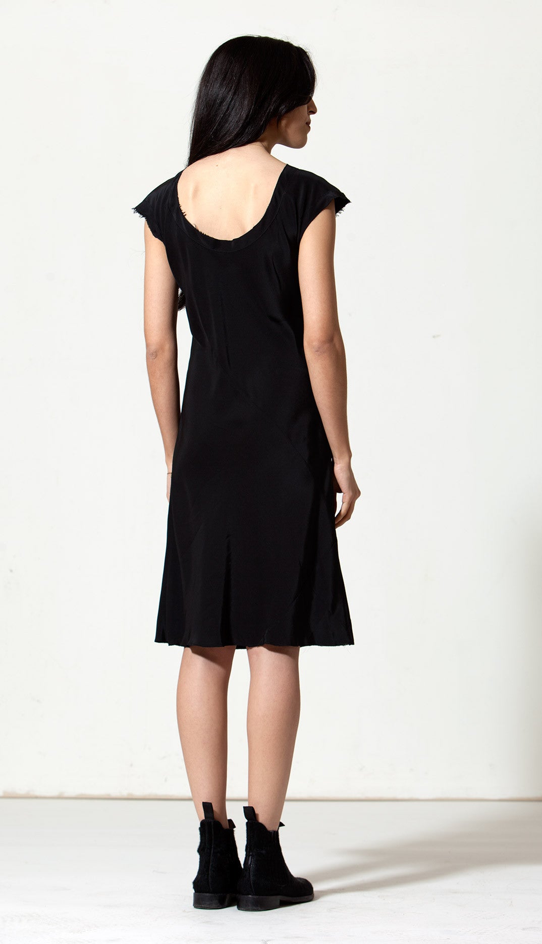 The knee-length version of our exceptionally flattering and super-versatile Ankle-Grazer Bias Silk dress, it's cut on the bias, so it skims fluidly over the body, creating a smooth silhouette that won’t cling— anywhere. And it is completely reversible, so you can wear it two ways: as a deep U-neck or a boatneck.