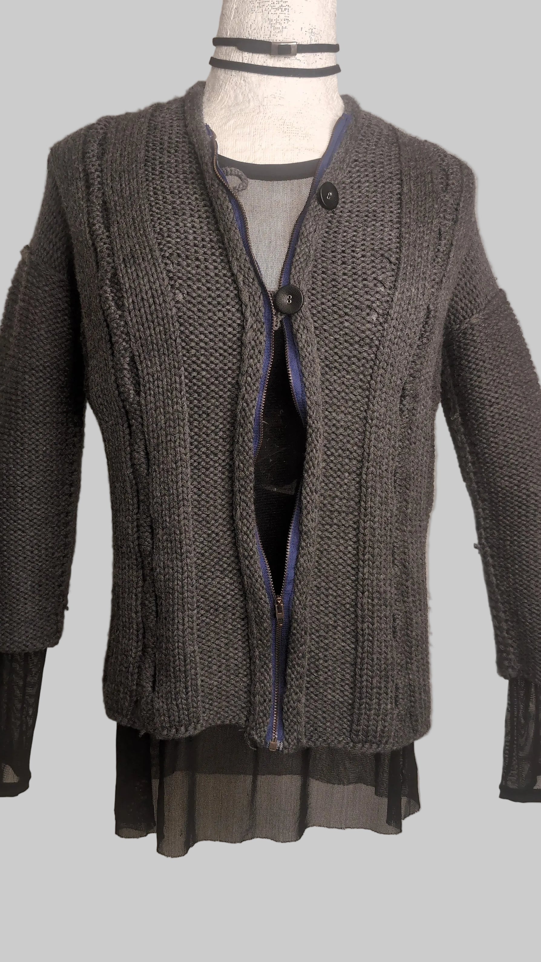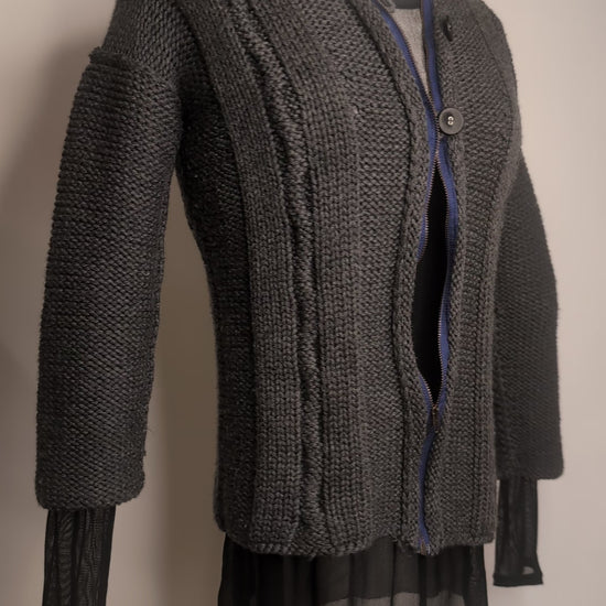 From The Fall 2011 collection. Handknit Wool Cardigan. Slate Grey. Zipper Front with 2 leather buttons. Size M