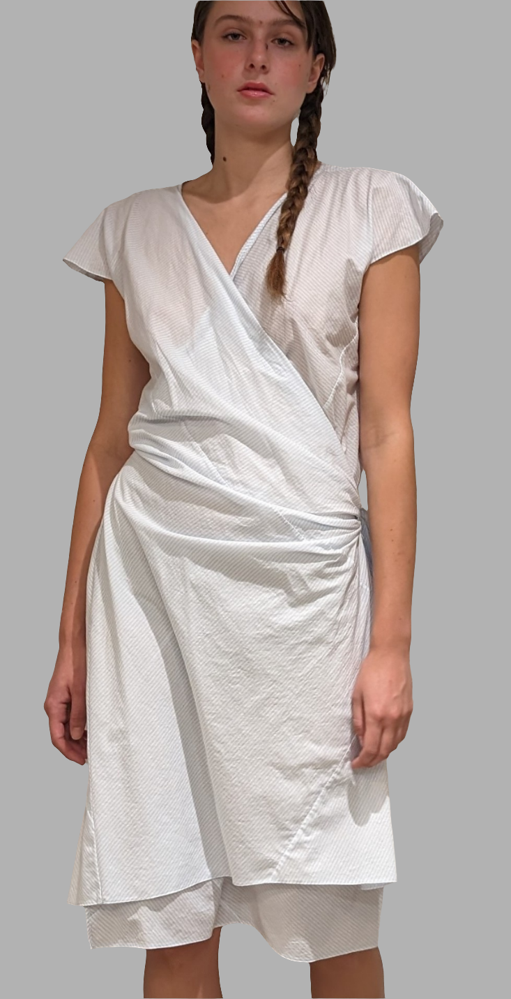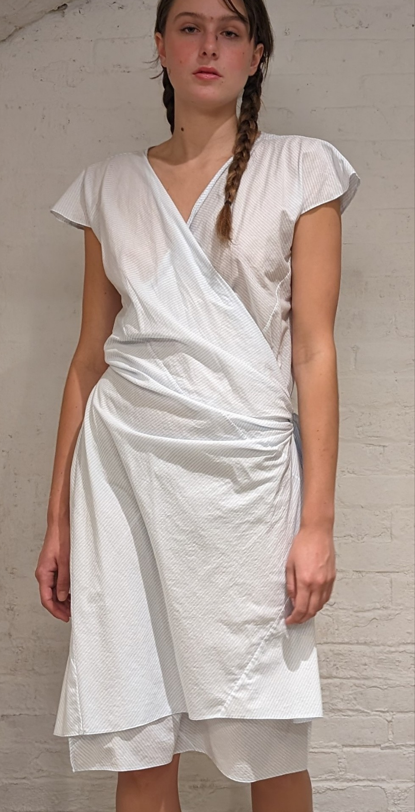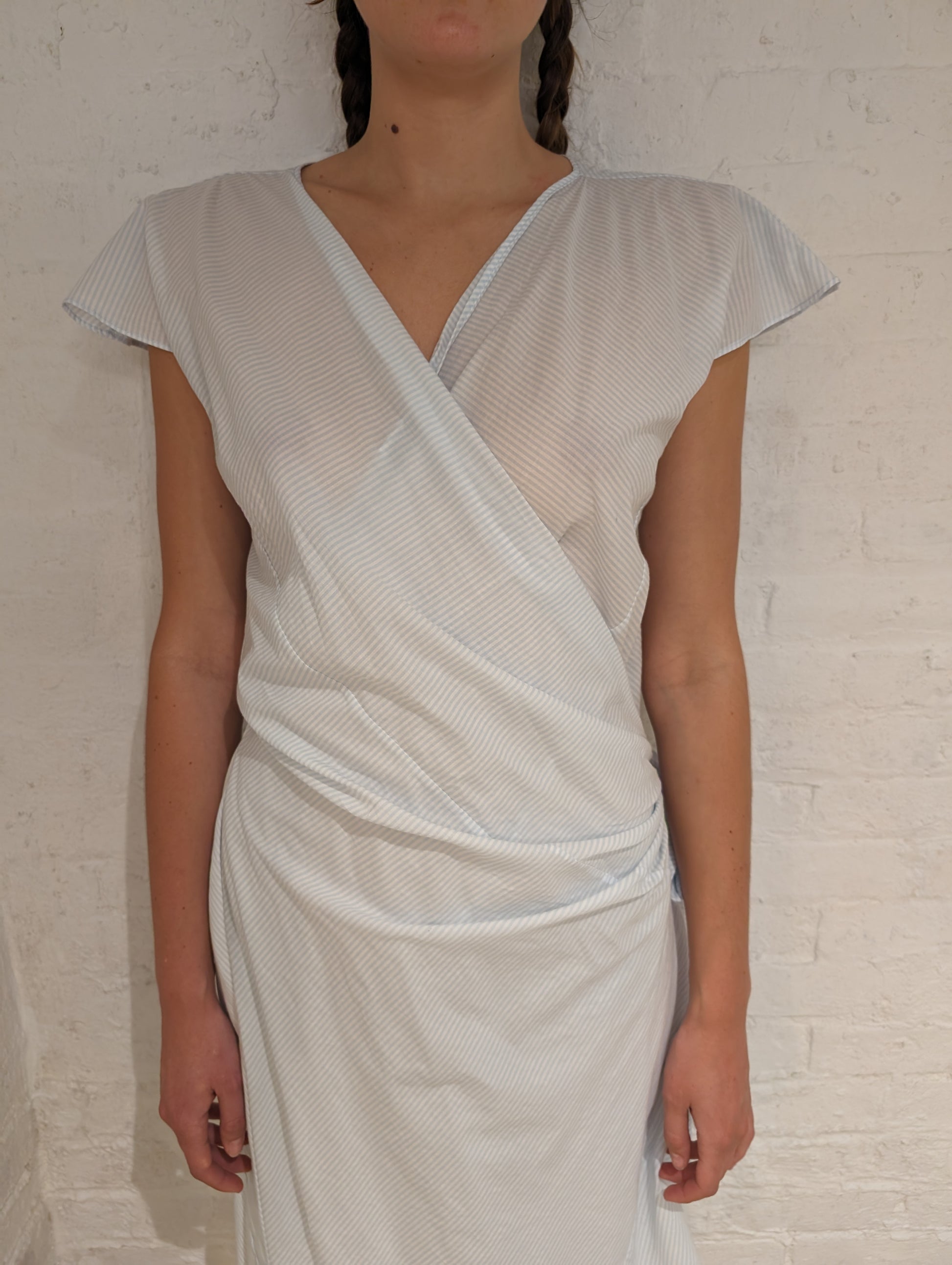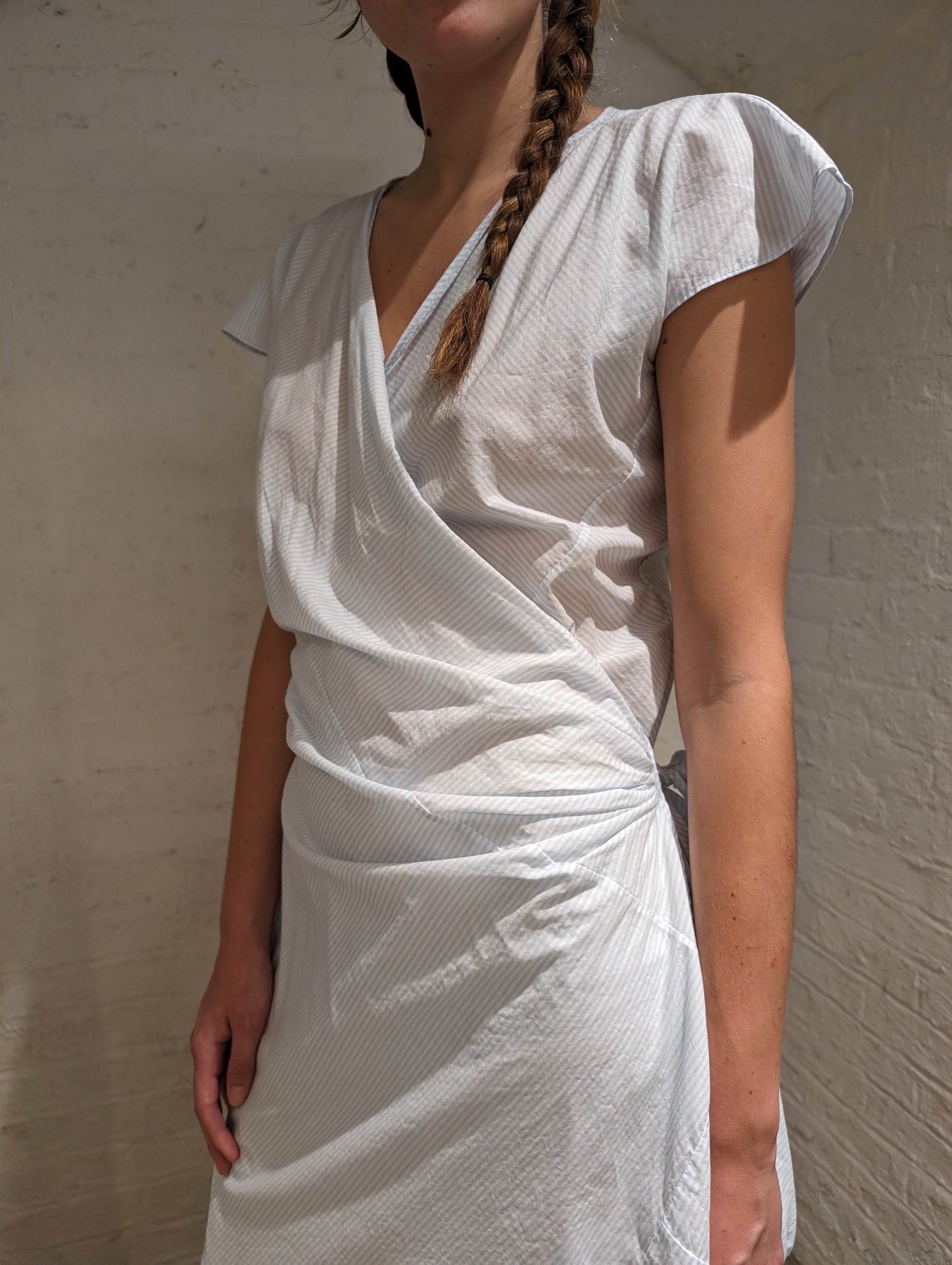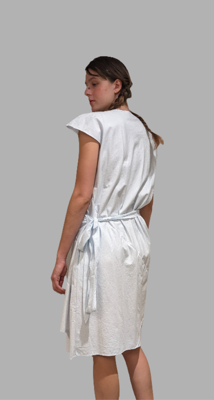 Baby Blue/white striped cotton wrap dress. Designed to be worn at the hips, can also be wrapped at the waist for a more fitted look. Limited edition. More fabrics coming soon. Email to special order.